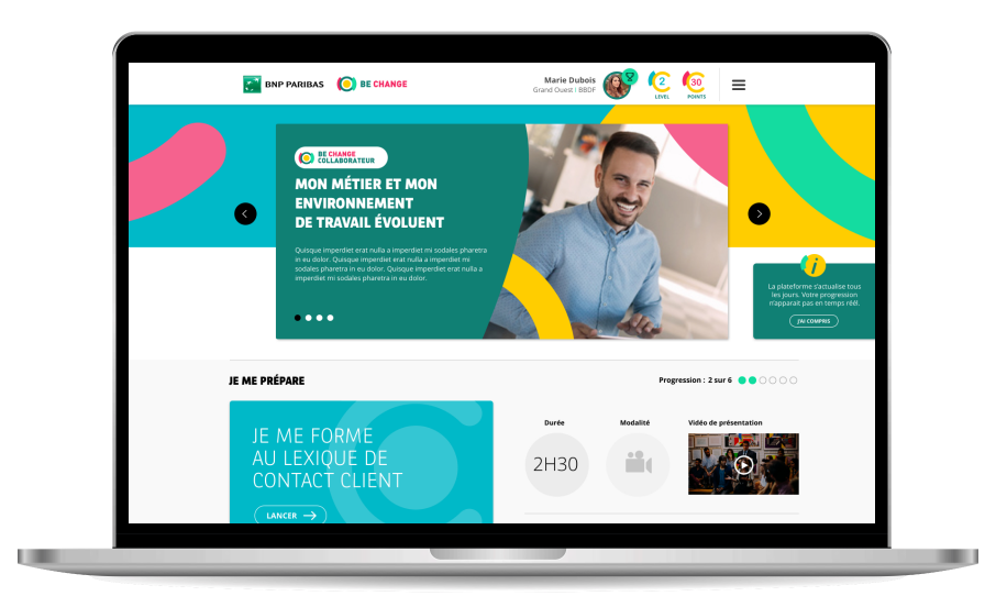 Conception et développement de la plateforme d’information et de formation Be Change, destinée à l’ensemble des collaborateurs du groupe.